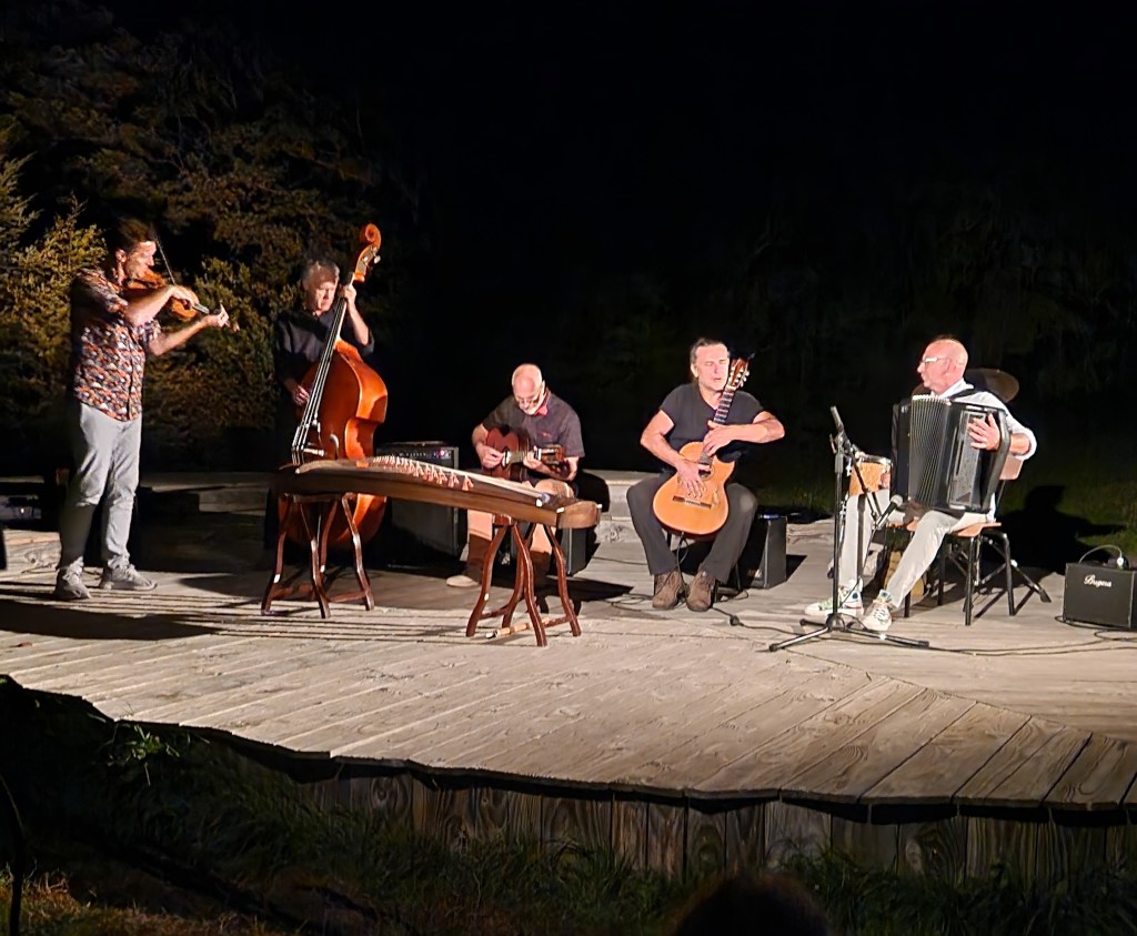 La soirée s’est terminée avec le concert sous les étoiles de Jan VANEK, nouvelle invitation au voyage là-aussi. La guitare bien entendu (instrument dont il utilise chaque cm2, toutes les surfaces et dans tous les sens) mais aussi gaïtas colombiennes (sorte de flûtes d’un mètre environ dont les têtes sont faîtes d’un mélange de cire d’abeille et de charbon végétal), vivo tahitien (flûte nasale), fujara slovaque ou autre sarod indien.