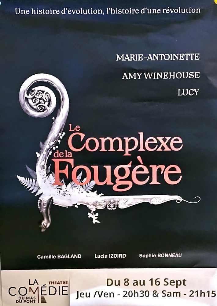 Je vous l’avais dit la semaine dernière (lire par ici) : la Comédie du Mas va présenter cette saison des spectacles un peu différents de ceux auxquels nous sommes habitués. Le complexe de la fougère fait partie de ceux-là. Le pitch ? Lucy et Marie-Antoinette accueillent Amy WHINEHOUSE dans leur sorte de purgatoire et tentent de lui faire décrire le monde d’où elle vient.