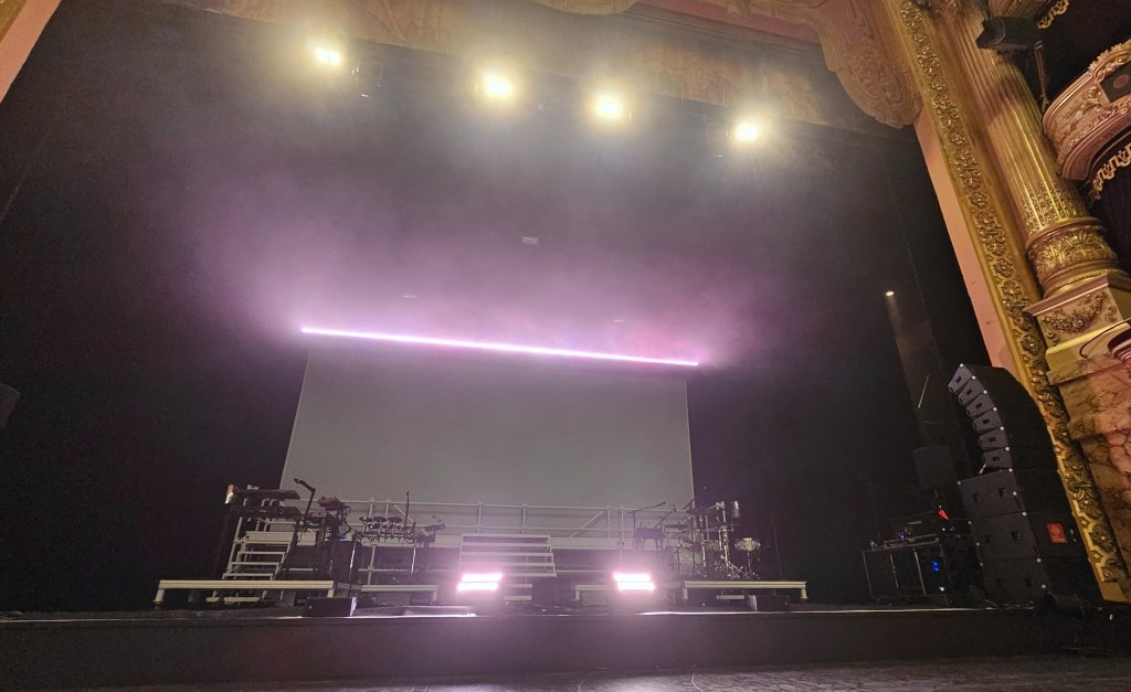 La scène est particulièrement intelligemment construite : très légèrement surélevée par rapport aux rangs d’orchestre puis une nouvelle fois surélevée de l’équivalent d’une marche deux ou trois mètres plus loin, ce qui permet d’avoir tout le monde « à hauteur d’homme » (contrairement au positionnement de l’Orchestre de Montpellier il y a quelques jours lors de la superbe soirée d’ouverture – lire par ici pour les retardataires). C’est d’ailleurs sur cette deuxième partie que sont positionnés les 4 musiciens (batterie, percussions électroniques, basse et clavier) et qu’évoluent le plus souvent Jeanne ADDED et ses deux choristes. En fond de scène, une passerelle avec, pour y accéder, un escalier à chaque extrémité et un autre au centre. Au fond, un grand fond blanc surplombé par une rampe de 200 spots environ couvrant toute sa largeur.