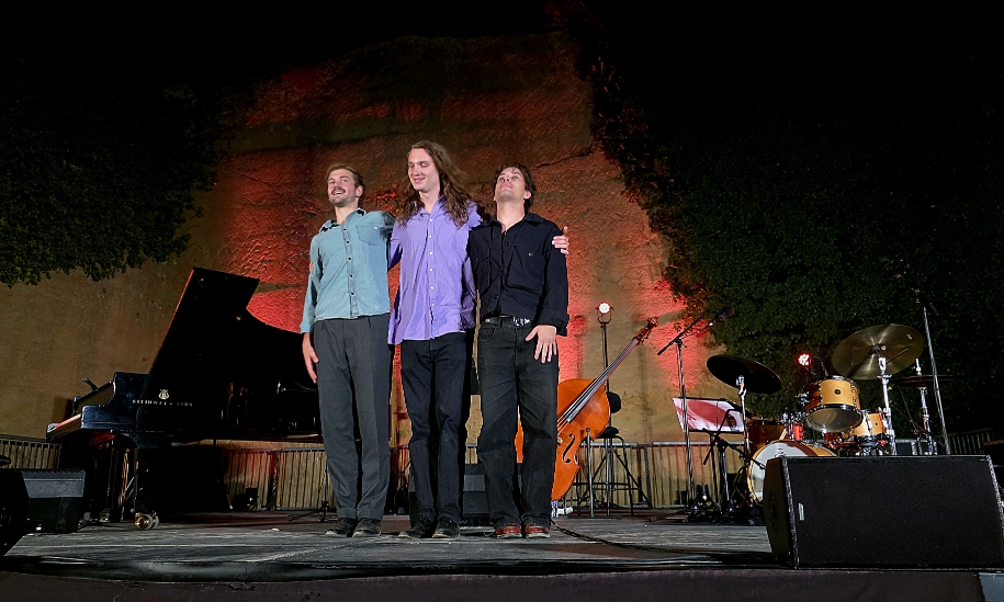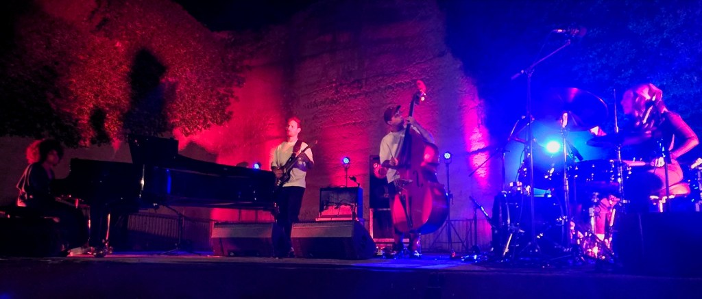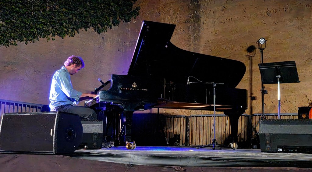 C’est Elias Vollmer et son trio qui ouvrent le bal de ces deux jours avec un programme intitulé « Vices et versa ». Accompagné de Johann Greve à la contrebasse et de l’excellent Steven Moser à la batterie, le pianiste d’origine américaine mais formé en Allemagne alterne les standards qu’il revisite et les compositions comme il alterne les morceaux endiablés et les morceaux plus subtils et plus raffinés. Sa musique évoque « les tiraillements de notre époque – entre surcharge d’information et besoin de silence, entre urgence climatique et inertie collective, entre individualisme numérique et quête de lien humain » comme l’annonce la feuille de salle. N’y a-t-il pas d’ailleurs un jeu de mots dans le titre du programme lui-même ?
